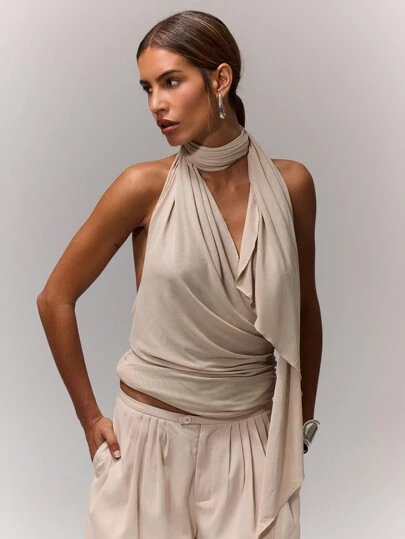 MUSERA Halter Neck Extreme Draped Top Ibiza For Spring Vacation Elegant Everyday Capsule Wardrobe Graduation Wedding Guest Going Out Tops Club Elegant - Light Grey - View 1