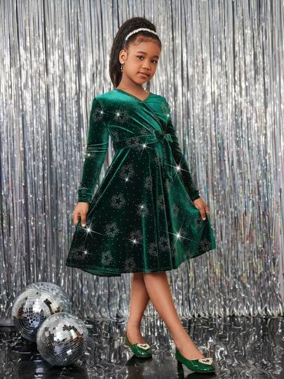 SHEIN Tween Girl Elegant Glamorous Dark Green Velvet Star Rhinestone Decor Ruffled Waist Party Dress For Christmas And Occasions - Green - View 1