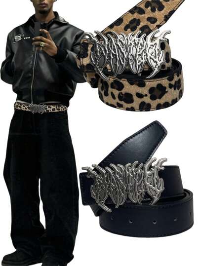 Moonlight Detachable Buckle Spiked Studded Punk Black Smooth/Leopard Fluffy Reversible Belt, Fashion Essential For Hoodie, Jacket, Summer, School Casual, Business, Boyfriend Husband Father Dad Men Gift, Daily Wear, Fashion, Teen, Outdoor, Vacation, Athletic, Travel, Street, Boho, Vintage Fall, Autumn, Halloween Autumn-Winter Accessories,Suitable For Teens, Youth,Men,Casual, Outdoor, Athletic, Vacation, Graduation Gifts, Birthday, Daily Wear - Multicolor - View 1