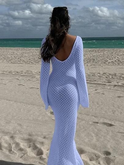 Women's Long Sleeve Hollow Out Swimsuit Cover Up, Elegant Bohemian Style Beach Vacation Dress, V-Neck - Blue - View 9