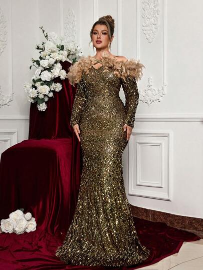 Glamrae Plus Size Glamorous Sheer Sequin & Natural Feather Long Sleeve Formal Gown, Wedding Guest Dress, Party Dress, Evening Dress - Gold - View 1