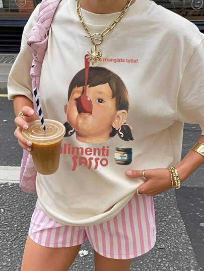 White Casual Daily Wear Girls Print Short Sleeve Round Neck T-Shirt For Women, Spring/Summer - Apricot - View 1