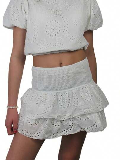 Women's Shirred Mini Skirt A-Line Pointelle High Waist Layered Ruffle Skirt For Summer Party Club - White - View 1