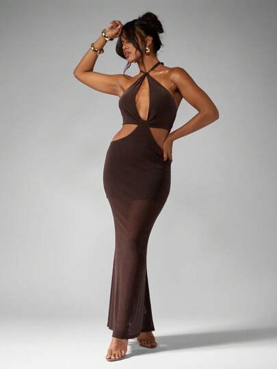 MISSGUIDED Sleek Halter Neck Cutout Maxi Dress Bronze Shimmer Evening Gown Wedding Guest Party Club Special Occasion Stretch Form Fitting Floor Length Dress - Black - View 1