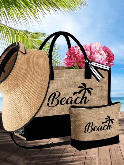 Beach Tote Bag Set For Women,With Women Beach Hat Ladies' Khaki Wave Beach Sun Hat, Printed With Beach And Coconut Tree Pattern Linen Tote Bag, Shoulder Bag, Handbag, Linen Makeup Bag