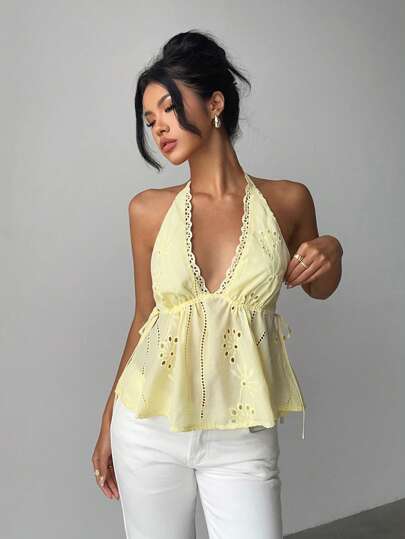 Aloruh Women's TYK Butter Yellow Cute V-Neck Side Tie-Up Revealing Back Ruched Embroidered Tank Top Women Summer Top Women Yellow Top Women Summer - Khaki - View 1