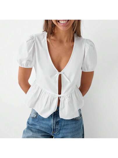 Women's Babydoll Tops Casual Loose Fitting V Neck Open Front Tie-Up Short Sleeve Ruffled Shirt For Summer - White - View 1