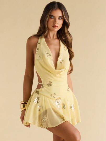 SHEIN BAE Women Solid Color Floral Sequin Halter Backless Dress,Boho Clothes Women,Valentine's Day,Valentine Outfits For Women - Yellow - View 1