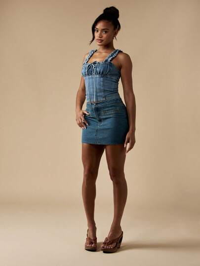 MISSGUIDED Western Style Mini Denim Skirt With Smocked Bodice Ruffle Straps Summer Festival Fashion Juniors High Waisted Above Knee Mini Skirt - Medium Wash - View 1