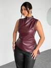Firerie Plus Size Women Elegant Vintage Sexy Motorcycle Chic Solid Color PU Leather Asymmetric Hem Ruched Waist Slim Fit Tank Top, Suitable For Spring, Spring Outfits For Women, Summer, Autumn, Winter