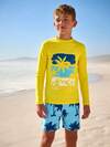 Fantacosmos Tween Boys 2-Piece Swimwear Set, Cool Surfing Style, Black Main Body, Raglan Sleeve Design, White "SURF" Letter Print On Front, Gradient Blue & White Palm Tree Print On Side And Sleeve, Gradient Blue & White Palm Tree All-Over Print Bottoms, Knitted Digital Printing, Fashionable, Casual, Suitable For Swimming, Summer Vacation, Beach, Pool Party