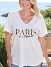 EMERY ROSE Casual Leopard Print "Paris" Letter Graphic V-Neck Short Sleeve Fitted Plus Size Women T-Shirt, Suitable For Summer