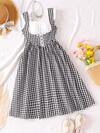 SHEIN Tween Girl Casual Elegant Cute Puff Sleeve A-Line Dress, Square Neck Plaid Drawstring Dress, Suitable For Spring, Summer, Autumn, Outdoor, Vacation, School