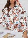 Marira 2pcs Women Pajama Set, Cute Dog Print, Fashionable Outfit For Outerwear, Soft & Comfortable Collared Long Sleeve Shirt And Elastic Waist Pants, Suitable For Holiday Party, Casual Outdoor And Homewear, Winter Clothes