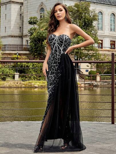 sequin mesh splicing off-the-shoulder bodycon dress - Black - View 1