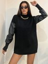 EURMUSE Contrast PU Sleeve Mock Neck Longline Jumper