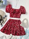 Elenzga Plus Size Women's Elegant Vintage Floral Jacquard Red Square Collar Waist Cinched Long Dress, Suitable For Summer, Back To School, Graduation, Holidays, Valentine's Day, Music Festivals, Mother's Day, Christmas, Halloween, Thanksgiving, Easter, National Day, Balls, Dates, Parties, Outings