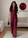 Serisse Women's Casual Solid Color Textured Fabric Sleeveless Top And Long Pants 2 Pieces Set, Summer Christmas New Year Burgundy Valentine's Day