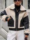 Firerie Borg Collar Teddy Lined Crop PU Jacket,Fall And Winter,Casual,Grunge,Black,PU,Long Sleeve Fashion Clothing