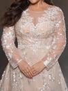 Glamrae Plus Size Elegant Minimalist Apricot Round Neck Sheer Deep V Long Sleeve Jacquard Decor Luxurious French Embroidered A-Line Tulle Embroidered Puff Skirt Bridal Wedding Dress